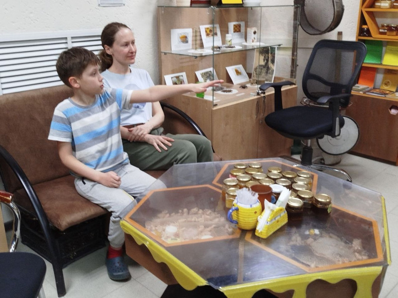 Сегодня у нас в гостях были мама с сыном Михаилом. Миша,  активный и любознательный мальчик, удивил нас своими знаниями о пчёлах. Он активно участвовал в беседе, задавал много интересных вопросов. Его интересовало всё: как пчёлы общаются, сколько собирают нектара, как созревает мёд, сколько глаз у пчелы? Покрутив медогонку, примерив шапку пчеловода и "поработав" дымарём, представил себя настоящим пчеловодом.